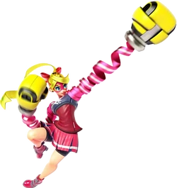 Ribbon Girl is a playable character in the fighting game ARMS. She is not only a popular ARMS fighter, but also a famous singer. She is known as "The Airess", and her fighting style is mostly aerial based.