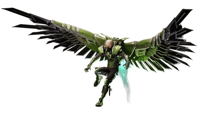 Electromagnetic Wing Harness: Utilizing his harness the Vulture is able to fly with a natural winged flight limit (95 miles per hour). The anti-graviton generator attached to his flight suit enables him to take to the air by flapping the bird-like wings he wears under his arms. When wearing his electromagnetic harness, the Vulture possesses superhuman strength, vitality and athletic prowess. The harness increases his physical strength to the absolute human maximum enabling him to lift roughly 700 pounds. When he removes the harness his enhanced abilities slowly fade, although the rate at which his abilities fade remains unclear. The harness also (according to some sources) increases his lifespan. The Vulture can reach speeds of up to 95 miles per hour and attain a maximum height of 11,000 feet. The Vulture has a new version of his flight harness that has supposedly been augmented by the Green Goblin. Though Vulture claimed that it made him several times stronger than his previous version (500% stronger) it appeared to be a bluff to frighten the Black Cat, who proceeded to beat him half to death. Considering she has no real superhuman powers and the severity of the beating she managed to give him it is very unlikely he was being entirely truthful. Vulture's harness also lets him fly virtually soundlessly.