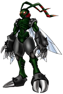Stingmon is Wormmon's natural Champion form, and unlike Wormmon, he is a formidable fighter with a cool and collected personality, and with strength far surpassing that of any of the DigiDestined's Armor-leveled Digimon as well as rivaling or slightly exceeding their Champion forms. Stingmon first shows up to defend the DigiDestined from a Control Spire in the shape of a Thundermon that was attacking Primary Village, and eventually the DigiDestined discover that he is Wormmon's Champion. He is also the one to single-handedly destroy an artificial Snimon and is instrumental in the defeat of Golemon, teaming up with Aquilamon in order to defeat it. At first, Stingmon and Ken work alone to destroy Arukenimon's fake Digimon and the Control Spires they are made of, but eventually they team up with the other DigiDestined, officially joining the group when Stingmon DNA Digivolves with ExVeemon to form Paildramon for the first time. Stingmon is Wormmon's Champion form in Digimon Tamers: Brave Tamer and Digimon Medley.